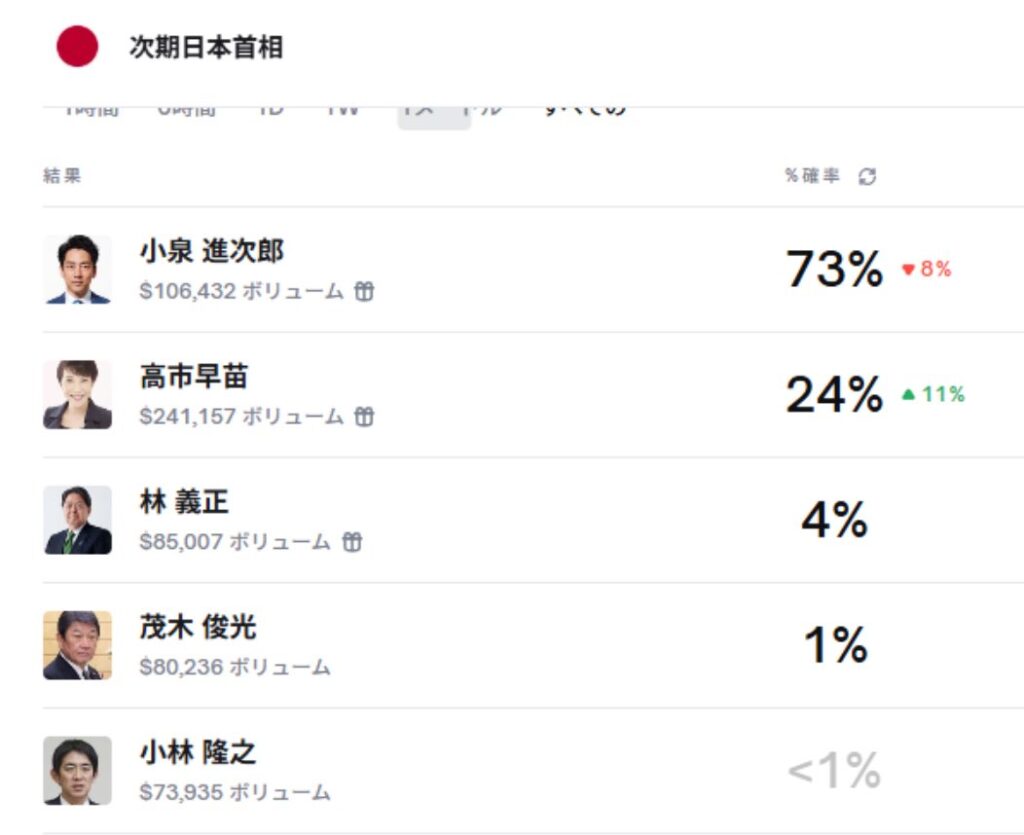 今朝の時点ですが、賭けサイトを見ると小泉さん優勢でしたが、高市さんもやや追い上げています。