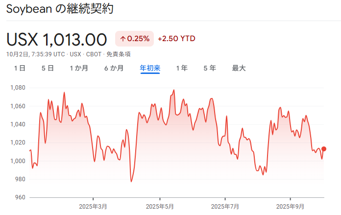 また、トランプと習近平が4週間後に会談するとのことで、トランプが自身のSNSに投稿。議題は「大豆」とのこと。ちなみにこちらが大豆の年初来チャート。