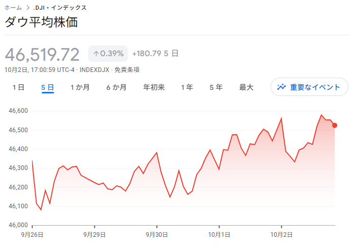 ダウ平均は20ドル高の46,461ドルで寄り付き、そのまま序盤は上値が重い展開でした。しかし利下げ期待から先行し、中盤から持ち直します。後半にはいってからは相場は上げ調子になり、最終的に78ドル高の46,519ドルまで上昇。最高値を更新し、これでダウは5日連騰となりました。