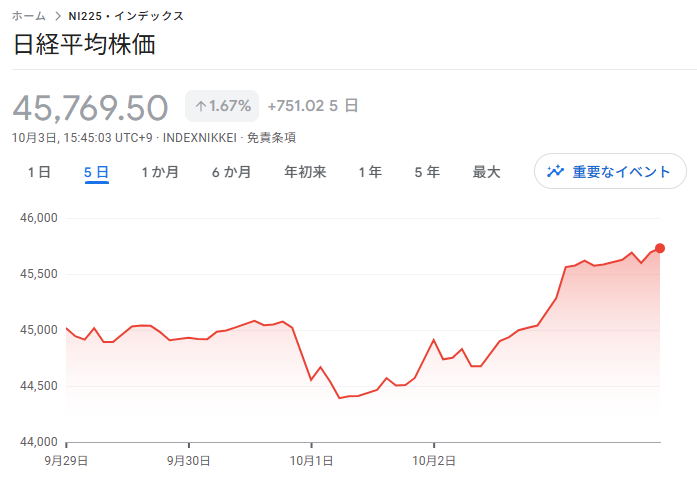 前場の中ごろには45,700円を超えるなど、買い優勢の流れで前場を終了。後場に入ってからも流れは変わらずで、今日は15時頃につけた45,778円が最高値になりました。