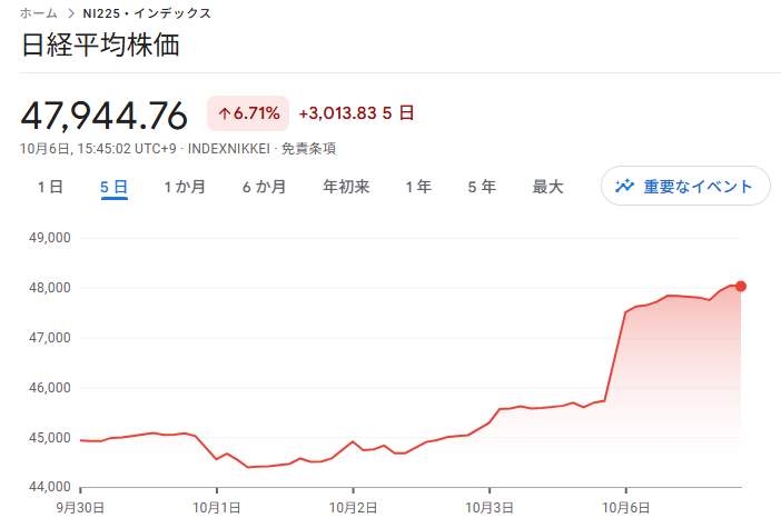 今週の相場が始まりました。まさに今日は「高市相場」といえる相場に。ストップ高になっている銘柄はまさに高市銘柄ど本命。日経平均は一時48,000円台に到達しました。