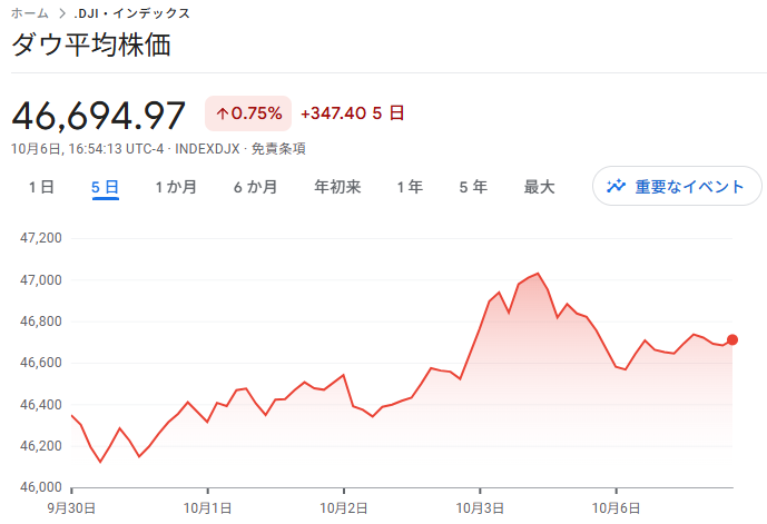 ダウ平均は17ドル高の46,776ドルで寄り付きました。ここまでかなり高騰しており、昨日は利益確定に売りが重なりました。序盤から崩れたダウでしたが、後半からは回復。最終的には63ドル安の46,694ドルで引けましたが、7日ぶりの下落となりました。