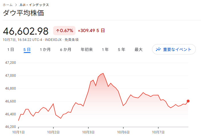 ダウ平均は5ドル高の46,700ドルで寄り付き、小幅ながら買い優勢でスタート。しかしこちらも利益確定の売りが優勢となり、軟調な展開になりました。