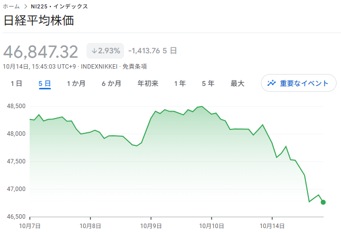今日の夕方から国民民主や維新、公明党が協議することも伝わり、より一層、相場の先行きが見えづらくなりました。後場は下げ幅を広げて、引け前に少し反発したものの最終的に日経平均は1,241円安の46,847円で大引けとなりました。