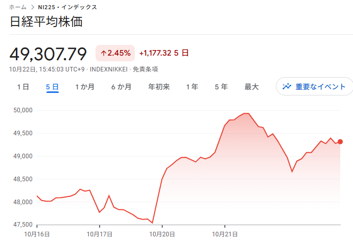 米国のハイテクがブレーキで、一方で主要企業の好決算からダウが上昇。日経平均もちょっとブレーキですね。高市総理になってめまぐるしく政局が動いており、マーケットもその動向を見定めるような動きです。