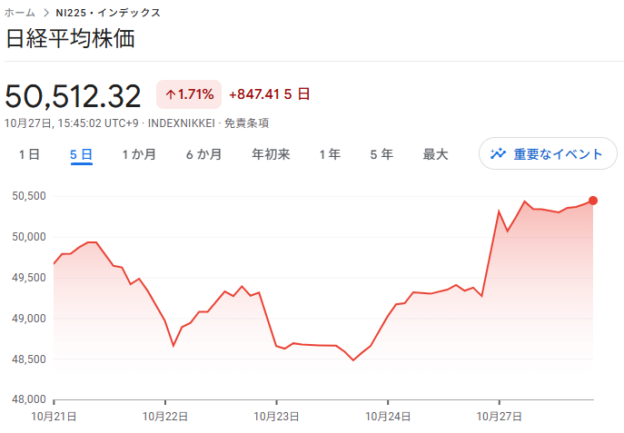 10月最終週のマーケット、早々に日経平均は5万円を超えてきました。いよいよ新しい世界へ!