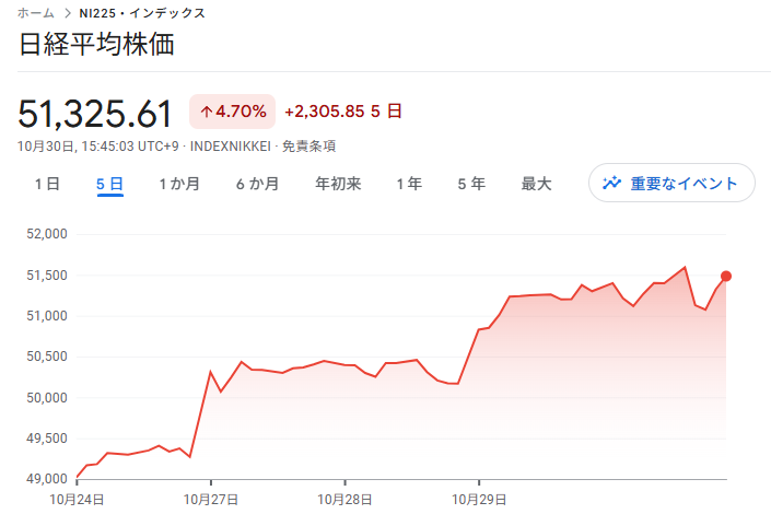 その後にドル円は153円まで円安が進行。日本株には追い風となり日経平均は買われました。その後、引けにかけて買われて日経平均は51,500円まで上昇。最終的には17円高の51,325円で大引けとなりました。