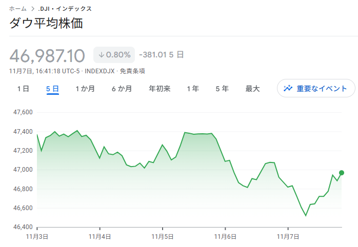 週末の米国株は、ダウ平均は115ドル安の46,797ドルで寄り付きましたが、ハイテク株を中心に売りが優勢となりました。終盤に買いに転じてプラスになりましたが、最終的に74ドル高の46,987ドルで引けました。