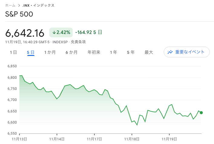 昨日はエヌビディアが3%ほど上昇するなど、決算への期待から買われました。ブロードコムやASMLなど半導体株が堅調で、アップルやGoogleなども上昇。これまで買われていたユナイテッドヘルスが下落、他にもボーイングやデル、マイクロソフト、メタなどは下落へ。