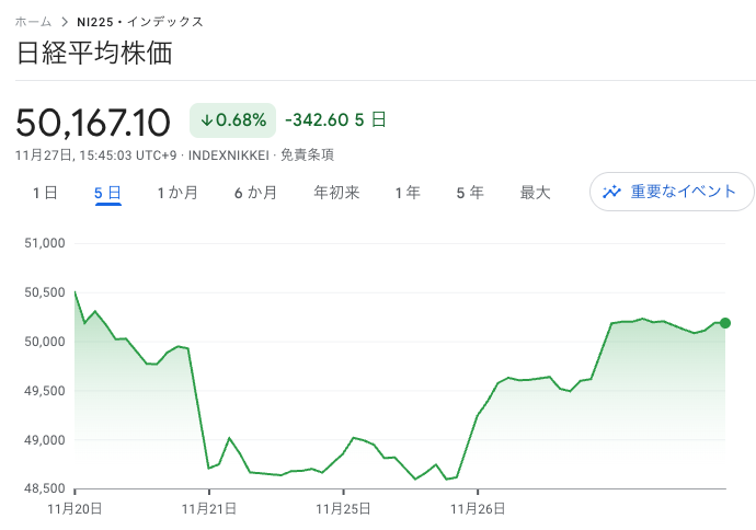 さて、日経平均は節目の5万円台まで回復しました。今日の米国が休みで、明日も半休のため、やや相場は閑散としそうです。ちょっと動きづらい展開になりそうですね。来週からはいよいよ12月相場です。
