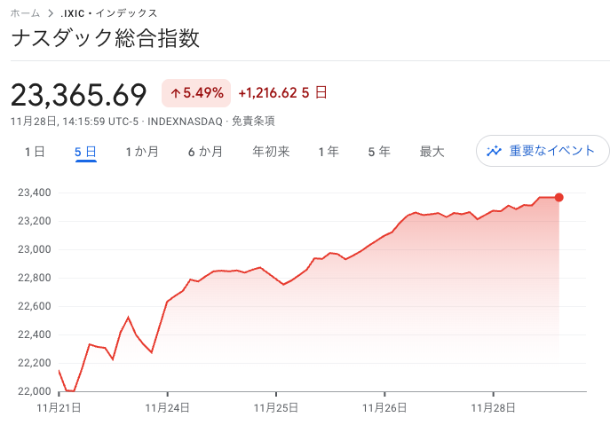 ちょうどブラックフライデーも開催していて、小売株も強い流れになり、終日買いが続く相場になりました。ダウは最終的には289ドル高の47,716ドルで取引を終えています。