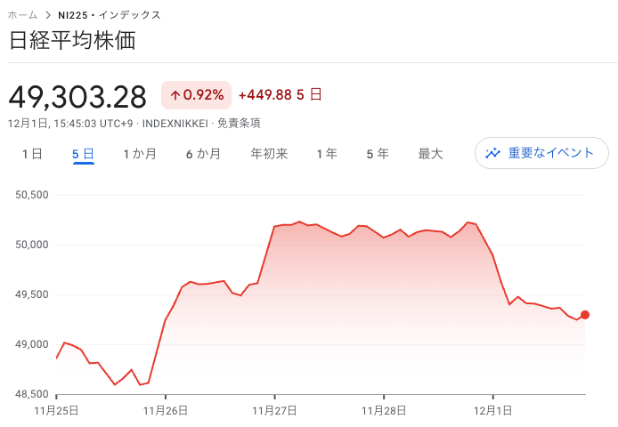 後場に入ってから少し下落が弱まりましたが、それでも日経平均は5万円を割れました。引けにかけてもさらに下落し、最終的には950円安の49,303円で5日ぶりの下落となりました。
