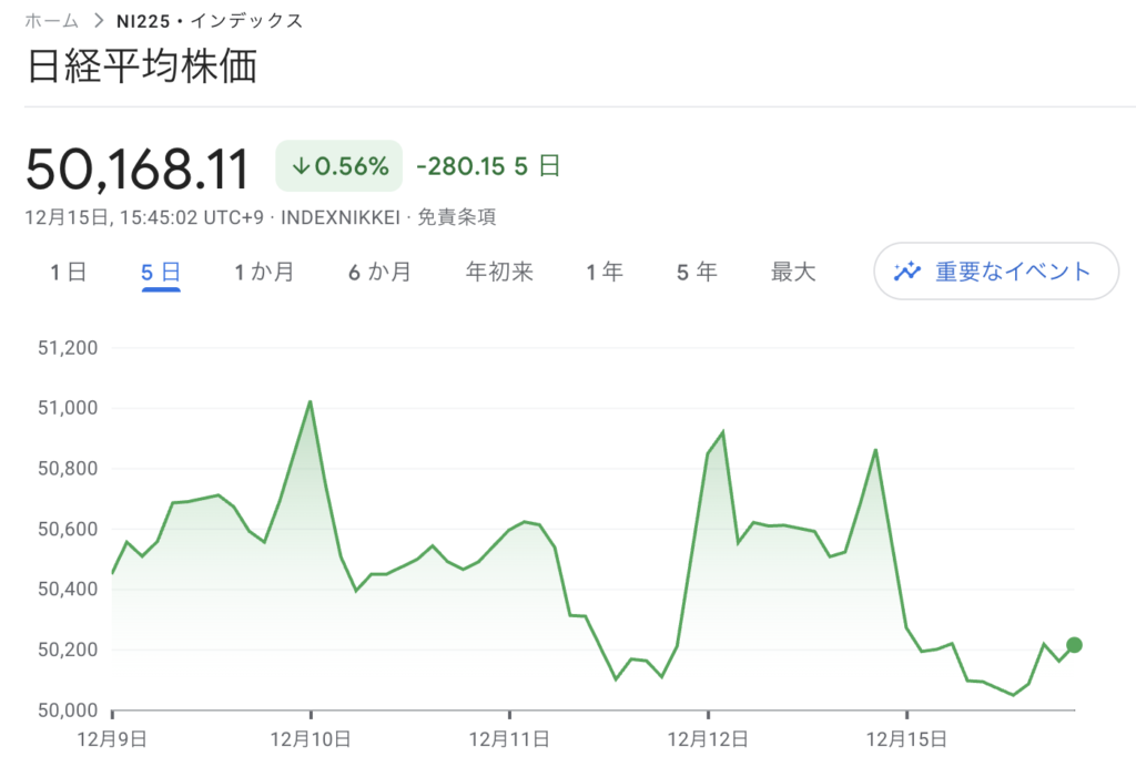 後場も下落して始まって、一時は49,965円まで下げました。節目の5万円を割れてイヤな空気になりつつ、押し目で買われる動きもありましたが最終的には668円安の50,168円で大引け。