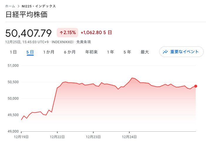 今日は任天堂やサンリオなども上昇。楽天や味の素なども強かったですね。一方でソフトバンクGやフジクラなどが重いです。住友金属鉱山も下げて、三井海洋開発や三井E&Sも下落。防衛株も重かったですね。海外勢がクリスマス休暇で、売買の勢いは弱かったですが、日経平均は5万円をキープ。