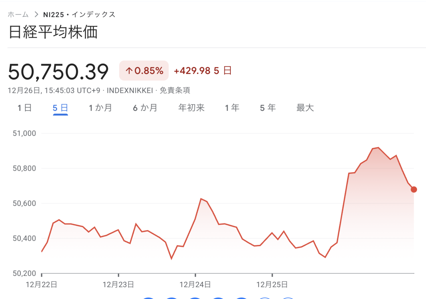 後場に入ってからも今日の高値圏でのレンジが続き、後場すぐに今日の高値に到達。これが50,941円でしたが、そのあとはやや伸び悩みました。最終的には342円高の50,750円となり、日経平均は続伸して大引けとなりました。
