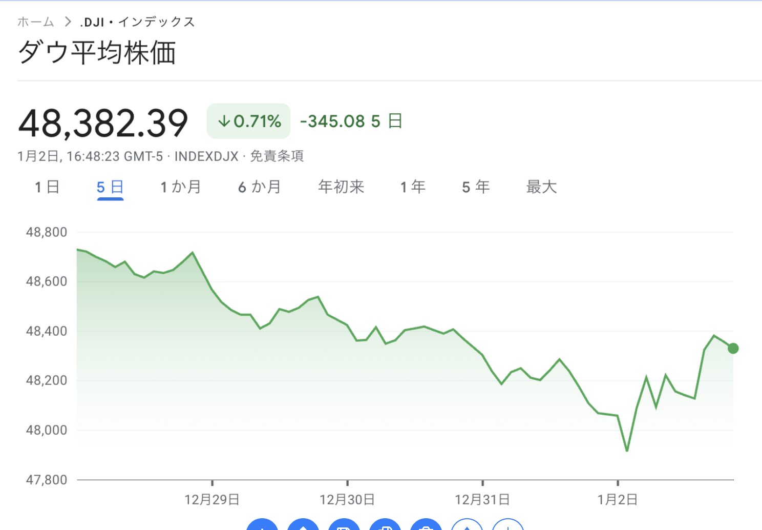 最終的に319ドル高の48,382ドル、