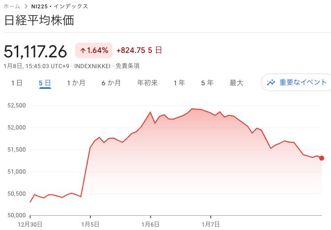 その後はハイテク株を中心に下落となり、後場はさらに下げる展開に。年初から大きく上昇していた反動もあって引け間際の15時20分頃に今日の安値を記録。結局最後は844円安の51,117で大引けになりました。節目の52,000円も割れましたね。