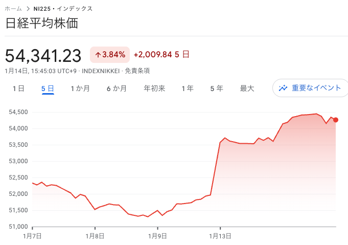 今日の相場も終わりましたが、引き続き続伸のマシマシ相場ですね。日経平均はついに54,000円台の新しい世界へ到達しました。一方で米国株はブレーキ。日米で明確に流れが分かれていますね。