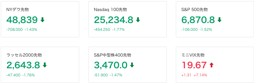 そして今日から米国もオープンですが、先物は下落中。欧州への関税や、グリーンランドを巡ってバタバタしてますね。