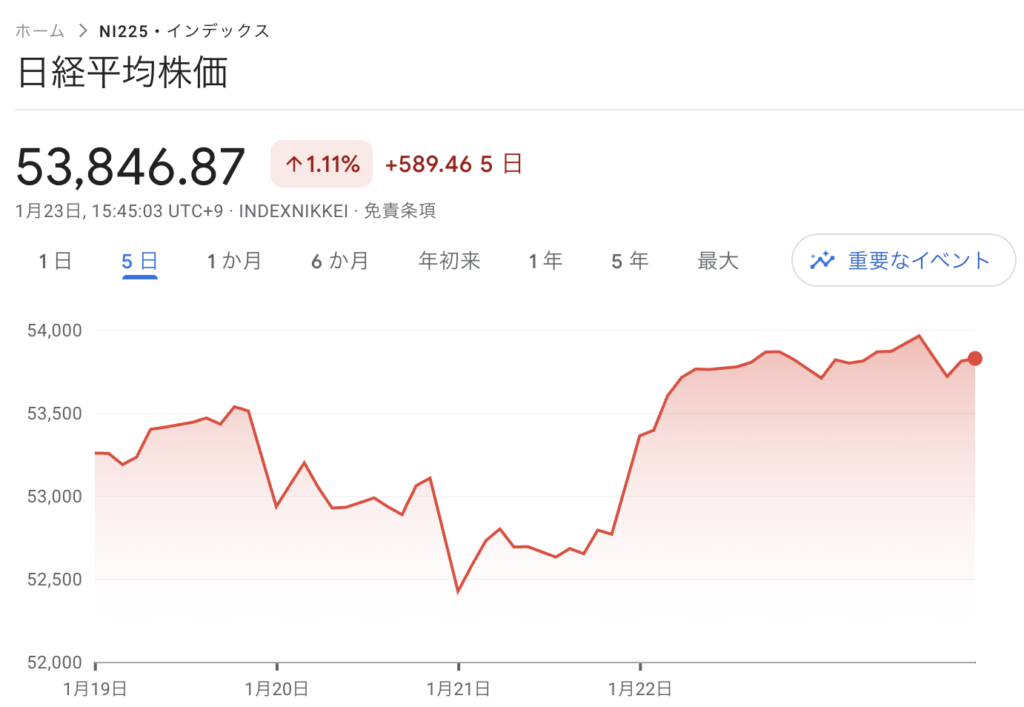 これで国内の半導体株の一角が売られました。そして正午過ぎに会合の結果が発表され、政策金利はそのまま。金融政策が維持されたことを受け、後場から上昇して一時は54,000円まで上げました。