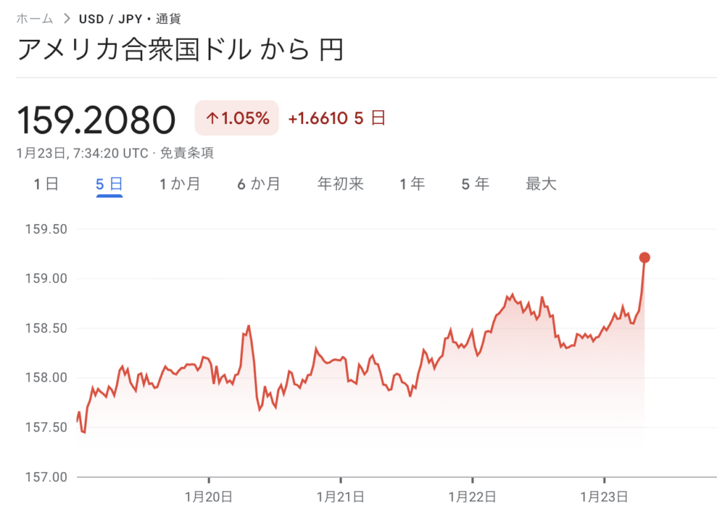 その内容を見て、為替が動いています。16時半現在、ドル円は159円台へ。
