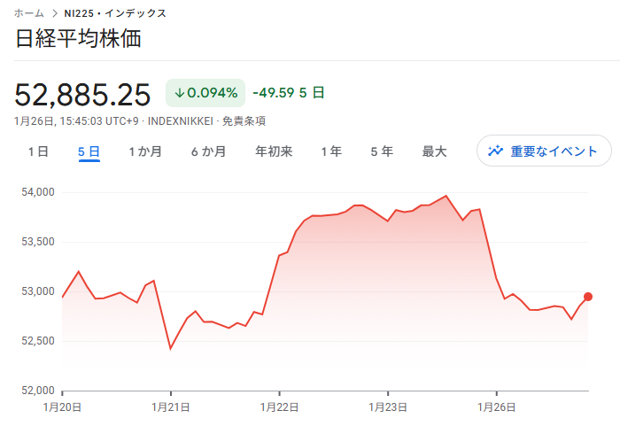 後場に入ってから少し回復しましたが、53,000円には届かず。世論調査での高市内閣の支持率低下も伝えられ、さらに決算も控えていることから上値が重い展開でした。日経平均は最終的に961円安の52,885円で大引け。