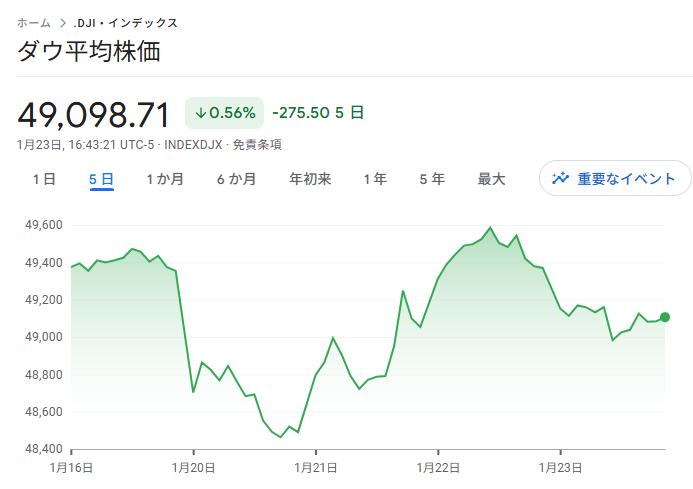 さらに中盤以降から下げが加速、後半はやや買い直されましたが、レンジを抜けれず。最終的には285ドル安の49,098ドルで3日ぶり反落でした。