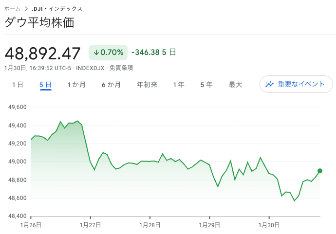ダウ平均はやや下げて始まり、序盤はレンジでしたが、中盤あたりから売りが加速。以降も上値が重い展開が続きました。ちょうど月末ということもあり、利益確定の売りも見られました。引けにかけては買われたものの、ダウ平均は179ドル安の48,892ドルで大引け。