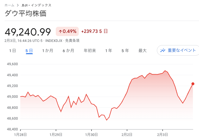ダウ平均はやや下落しましたが、出だしは堅調だったものの中盤から流れが一変。下げ幅を拡大する展開になり、朝方には節目の49,000ドルを割れます。しかし引けにかけて再び買われて浮上し、最終的には166ドル安の49,240ドルで引けました。