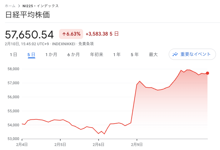 TOPIXも連騰しており、連日で最高値を更新。今日も売買が活況で10兆円近くになり、日経平均は最終的に1,286円高の57,650円で大引けとなりました。