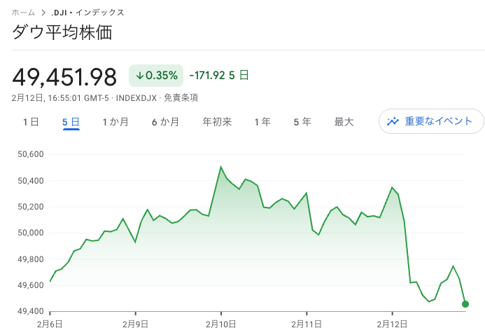 ダウ平均は小幅反発で始まりましたが、勢いがあったのは最初だけで、中盤以降は下げ幅を広げていきます。一時は49,420ドルまで下落するなど、5万ドルを挟んで引き続き攻防戦です。