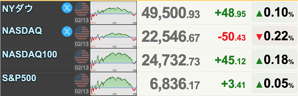 まだディフェンス株が買われていることからダウ平均は堅調ですが、終値で小幅プラス程度。防衛株など一部の決算好調銘柄が強いですが、全体はAI不安が残っている印象ですね。