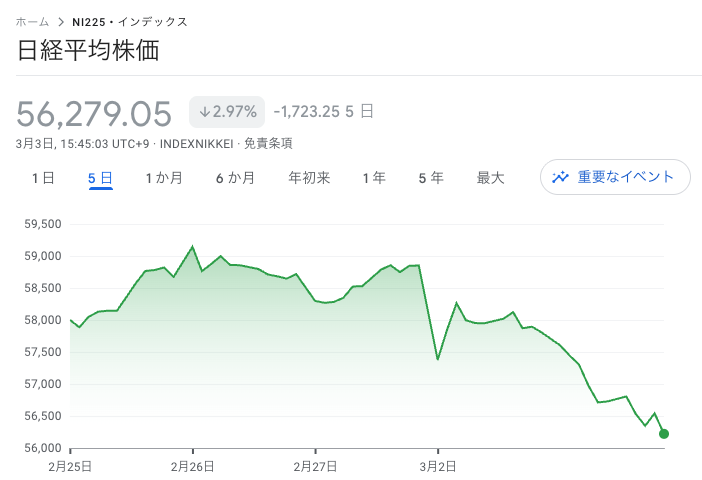 これで日経平均は2日連続で1500円超の下げ。57,000円を割れるのは5営業日ぶりで、過熱調整+地政学リスクのダブルパンチ。