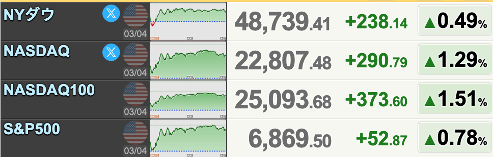 ダウ平均は88ドル高の48,589ドルでスタート。序盤は売られましたが、その後は持ち直し。後半に入ってからはレンジで、最終的には238ドル高の48,739ドルと反発して引けています。
