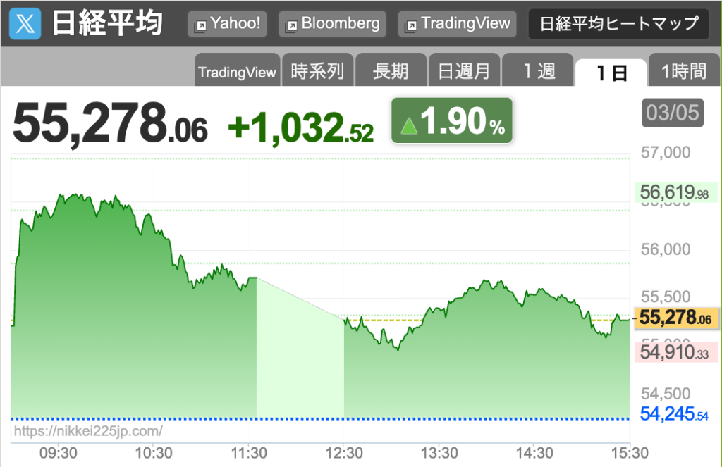 後場からは再び売られる動きで方向感のない展開になり、さらに米国株先物も重い立ち上がりで、後場は上げ幅を縮めました。最終的には1,032円高の55,278円で大引け。