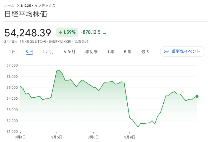 日経平均は11時頃に約2,000円高となり、今日の高値に到達しました。後場に入ってからは少し下落しましたが、引けにかけてはジリジリと買い上がり、最終的に1,519円高の54,248円で大引け。