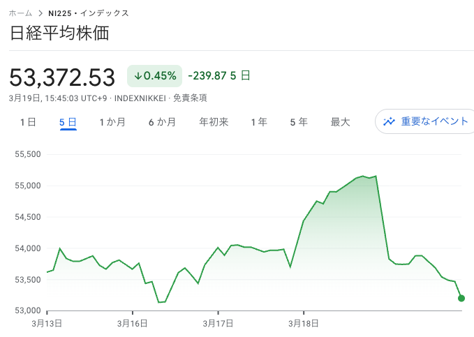 注目の会合も「利上げなし」が決定。市場のコンセンサス通りの結果でした。最終的に日経平均は1,866円安の53,372円で大引け。