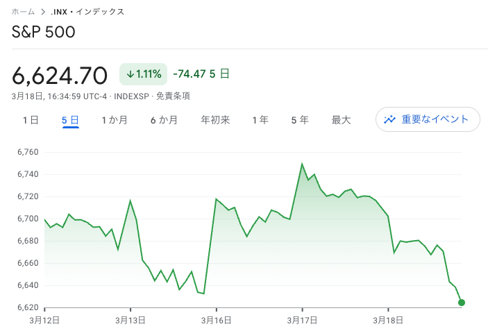 S&P500は91ポイント安の6,624まで下落、ナスダックは327ポイント安の22,152で引けています。