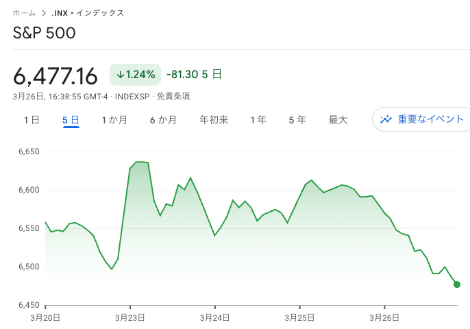 S&P500は1月以来の大きな下落率となり、週足でも5週連続の下落ペースに。中東情勢の先行き不透明感から週末のインフレデータも警戒されていますね。(3月のデータは4月に出るので来月が怖いです)