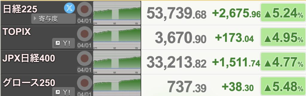今日から4月相場となりましたが、さっそく反発スタートです。日経平均は5%ほど上昇しましたが、指数が5%もあげることは珍しく、幸先いいスタートですね!