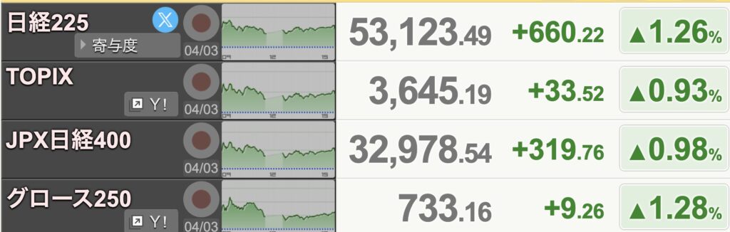 日経平均は最終的に660円高の53,123円で大引けとなり、TOPIXは33ポイント高の3,645となりました。グロース250は9ポイント高の733で引けています。