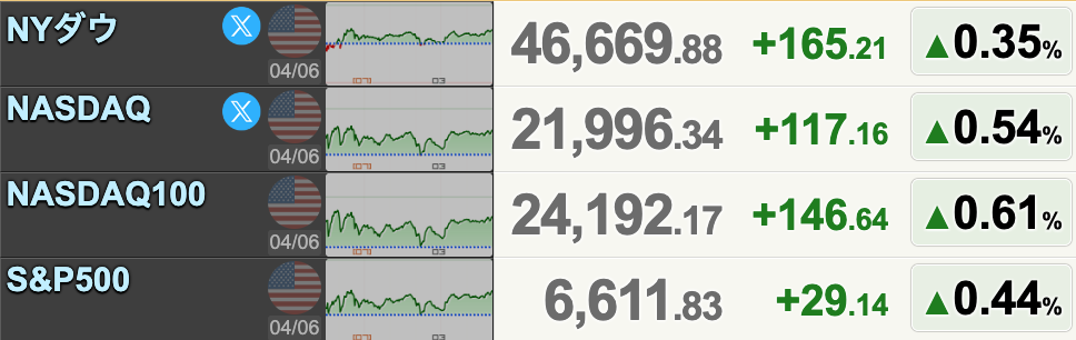 序盤は買いが先行し、ダウ平均は32ドル安の46,472ドルでスタート。停戦期待から徐々に買いが優勢になり、一時は46,700ドルまで上昇しました。中盤は再び下落しましたが、引けにかけてはまた買われて、最終的に165ドル高の46,669ドルで引けています。