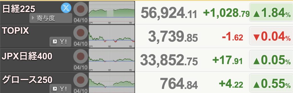 結局1,000円超の大幅高で引けで、上値の重さがやや和らいだ形になりました。最終的に日経平均は1,028円高の56,924円で大引け。TOPIXは1ポイント安の3,739ポイントと続落しました。