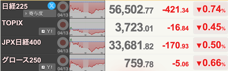 日経平均は大引け間際に少し買われましたが、最終的に421円安の56,502円で引けています。TOPIXは16ポイント安の3,723と3日続落です。売買代金は7兆2504億円でした。