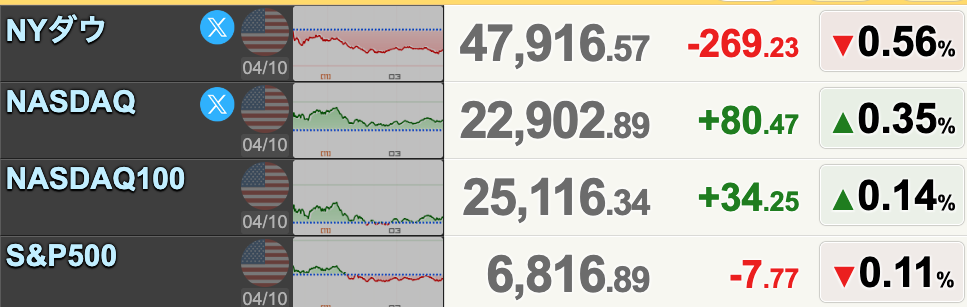 寄り付き直後のダウはプラス圏へ上昇しましたが失速。そのあとはレンジになり、高値を追う動きは限定的でした。最終的に269ドル安の47,916ドルで取引を終えています。