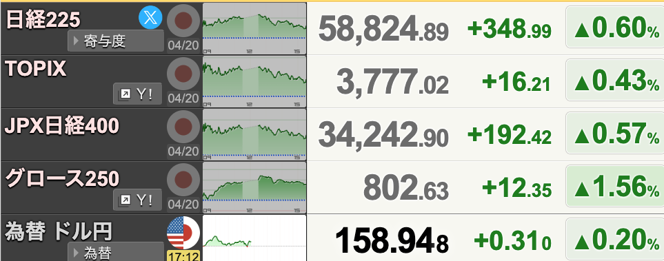 日経平均は59,000円台に乗せる場面もありましたが、買いは続かず。最終的に日経平均は348円高の58,824円で引けています。売買代金は6兆5727億円でした。