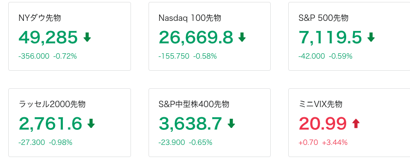 17時現在の米国株はそれぞれ先物が下落しています。