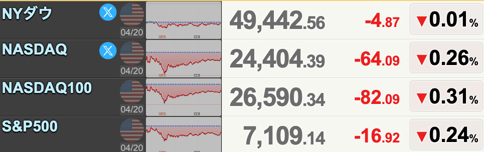 ナスダックは64ポイント安の24,404と14日ぶりに下落。S&P500は16ポイント安の7,109で、こちらは6日ぶりに反落しました。