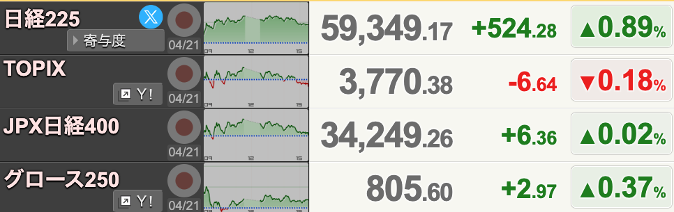 後場は利益確定の売りが出たため、重くなりましたが、最終的に524円高の59,349円と続伸。TOPIXは6ポイント安の3,770に反落、グロース250も2ポイント高の805まで上昇しました。
