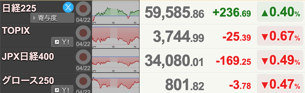 後場に入っても流れは変わらずで、引けにかけても再び浮上。最終的に236円高の59,585円で大引けとなりました。